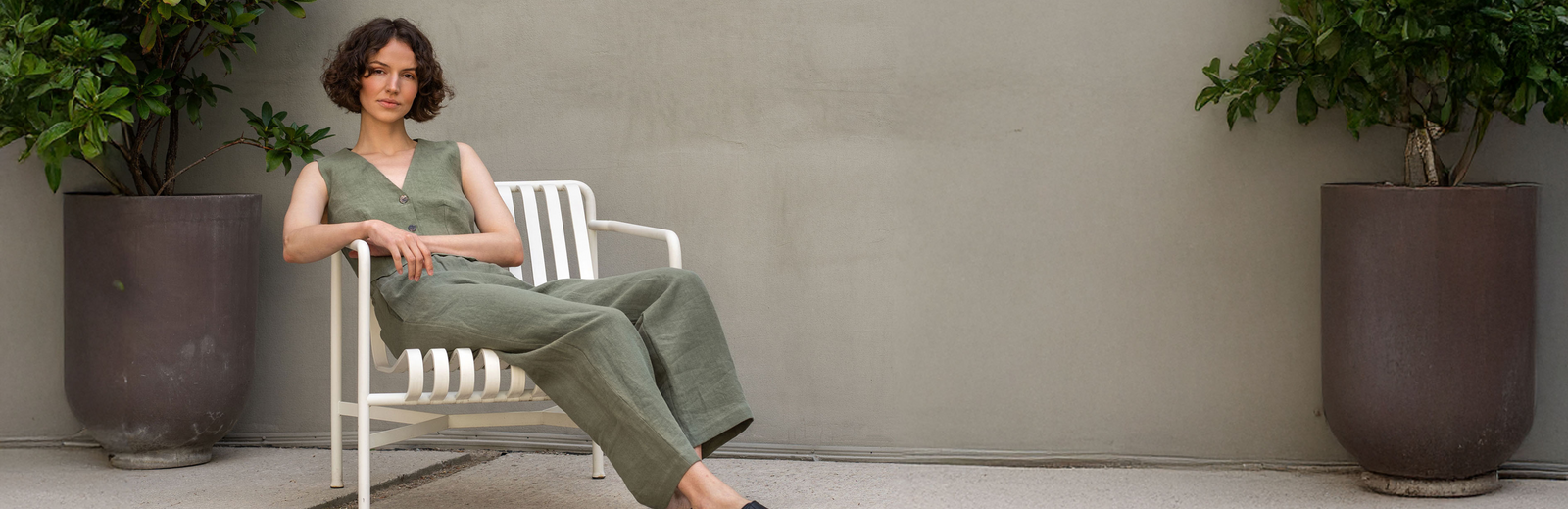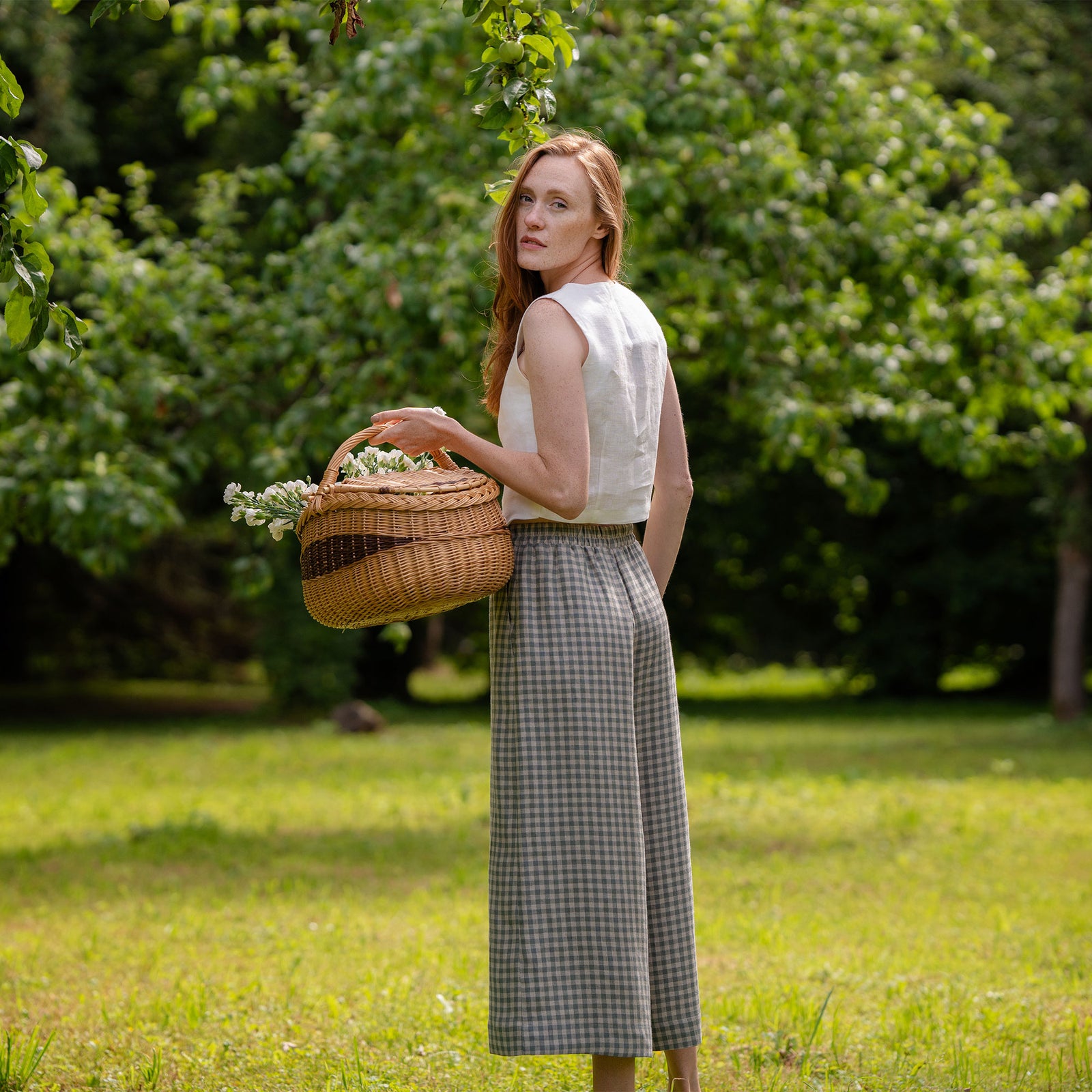 The model is posing sideways, revealing the elastic band at the back of her green gingham pattern linen pants. It is visible, that the pants are slightly cropped and a bit above her ankles. She is holding a basket full of flowers.