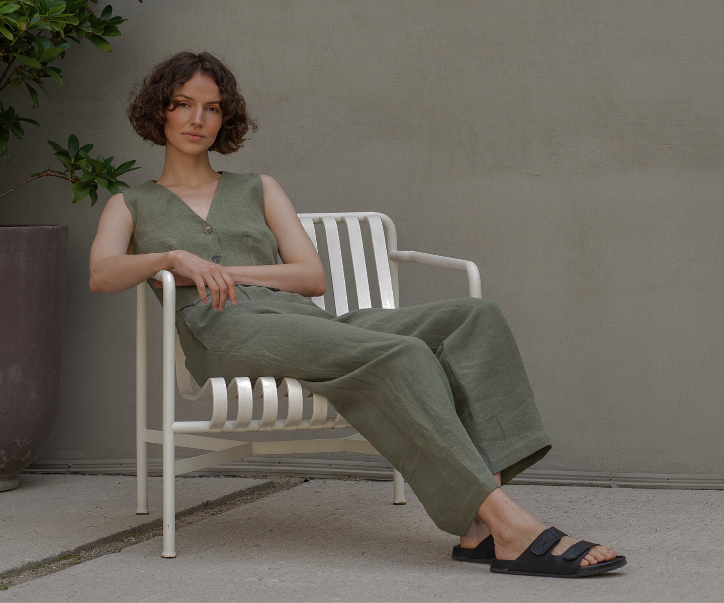 Person wearing storm blue linen menique pants and brown sandals on a neutral background