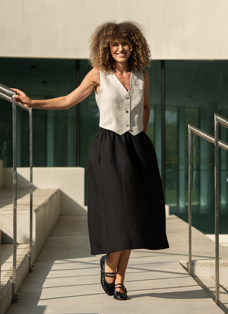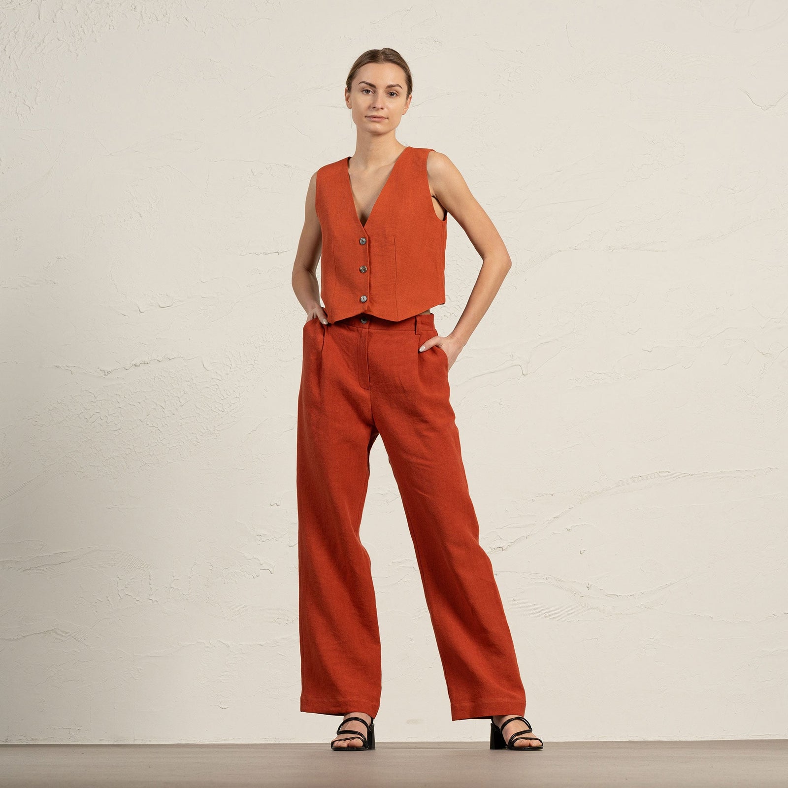 A fair-skinned woman models a cinnamon red colored linen vest and wide-leg trousers, standing against a textured light beige wall. She is wearing black sandals.