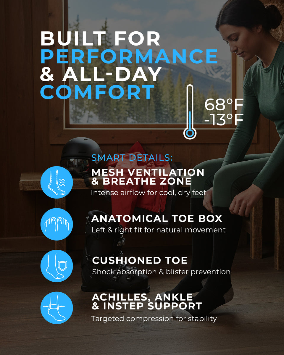 Meet your winter adventures with women’s thermal ski socks, made from a luxurious blend of Merino wool. Designed to support you from the first lift to the last run, these performance socks offer the perfect harmony of softness, warmth, and breathability – ideal for skiing, snowboarding, hiking or simply enjoying the cold in comfort. Merino wool’s natural temperature-regulating and moisture-wicking properties keep your feet warm and dry without overheating, while wool socks' silky touch feels gentle against the skin, even after hours in your boots.Enjoy the added comfort of extra cushioning, making these functional socks powerful in performance and ready for the mountains – these are the long socks your winter wardrobe has been waiting for!