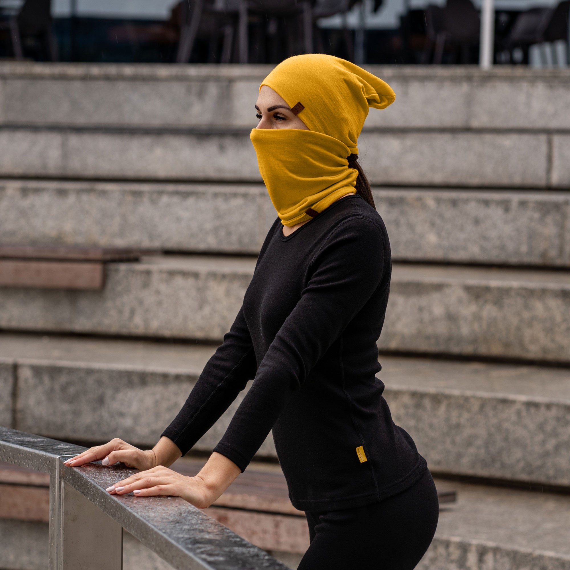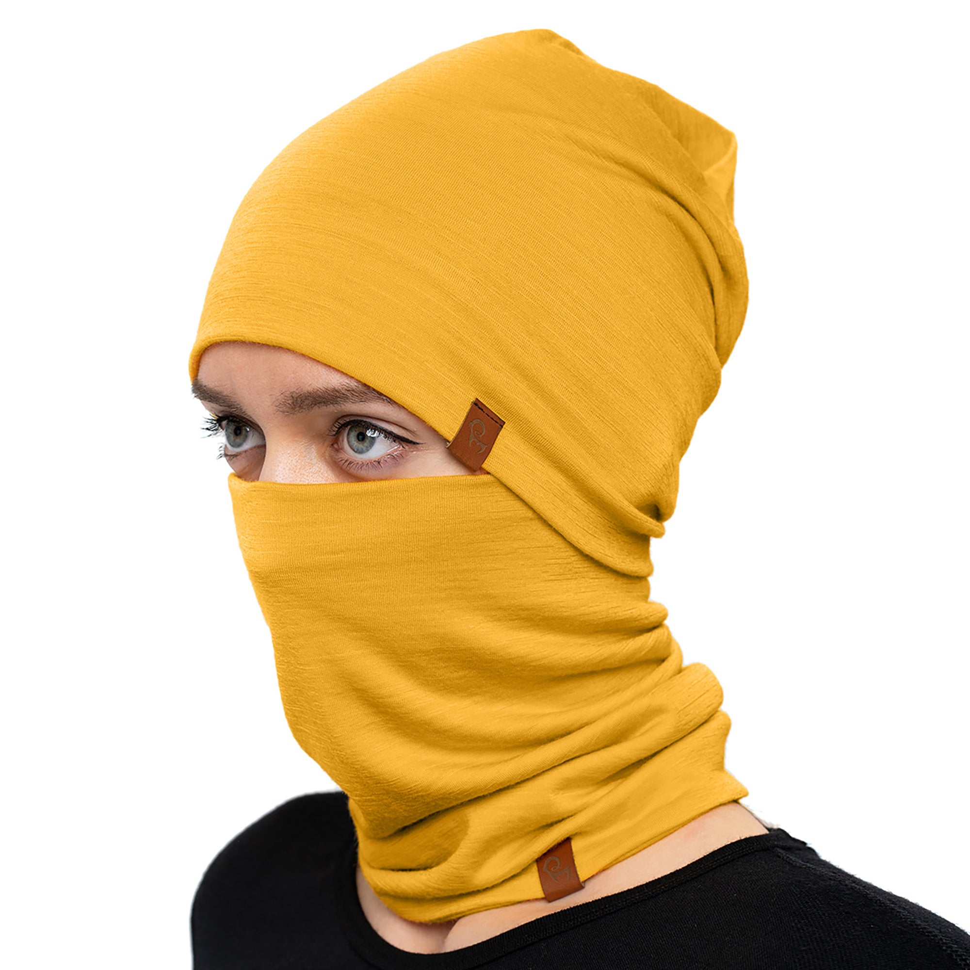 Woman in yellow Merino beanie and gaiter worn around neck, posing in black long sleeve top – side view.