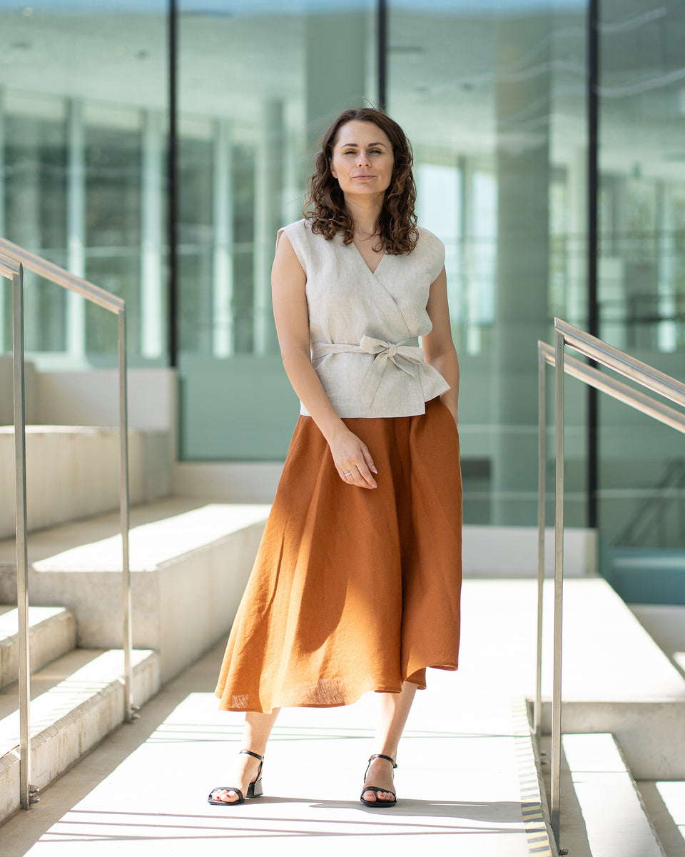 Ruby wrap top has relaxed and loose fit. We suggest taking your usual size in this style to achieve the look as shown in pictures. Please note, the garment naturally softens and relaxes as you wear it throughout the day. It’ll become more comfortable as you move around in it. We're currently in the final stages of preparing our sizing charts, and we assure you that they will be made available shortly. We sincerely appreciate your patience and understanding. If you have doubts about the appropriate size, do not hesitate to contact us.