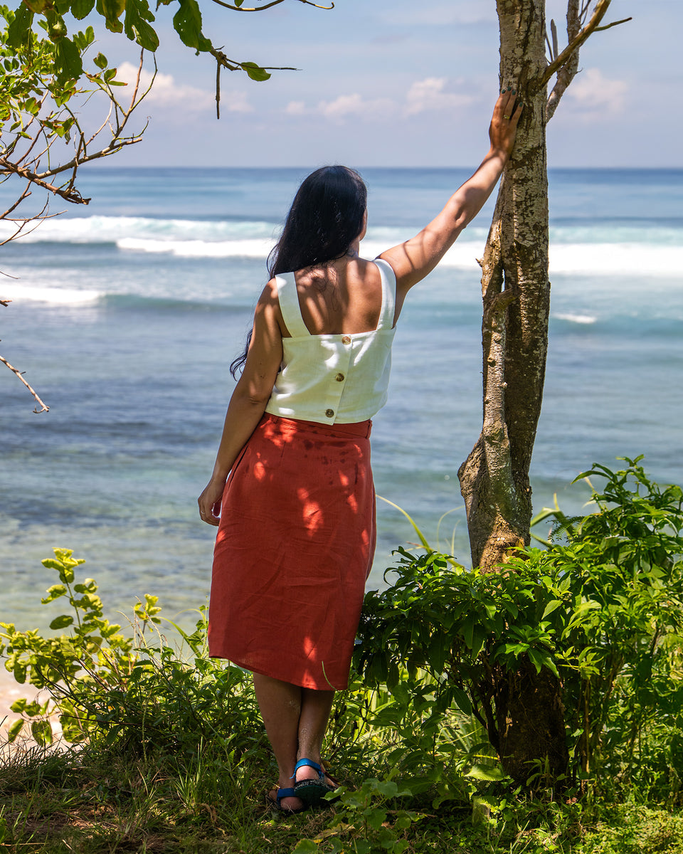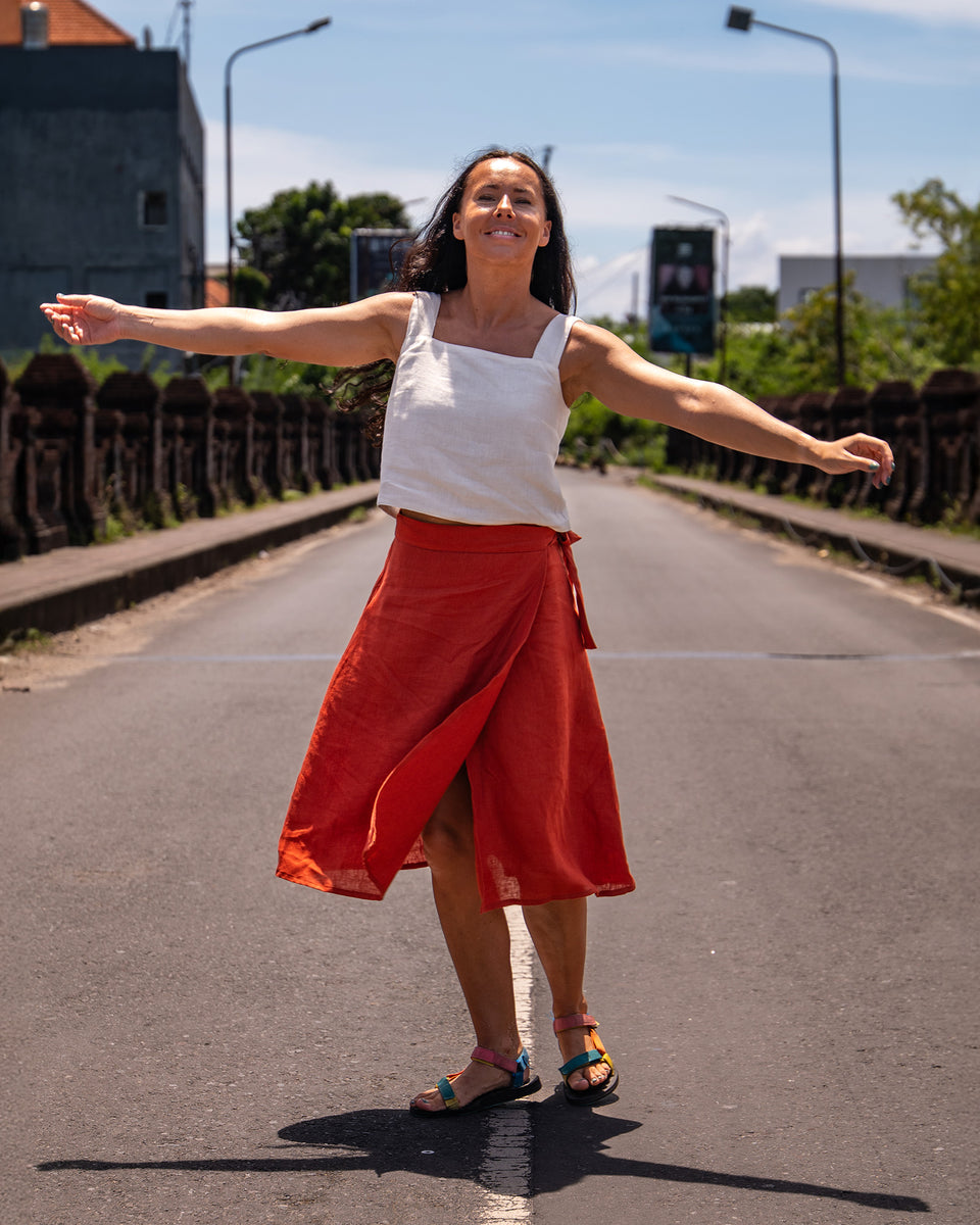 Soft and breathable, our linen wrap skirt – designed to gently hug your body – offers an adjustable fit for all-day comfort. The sewn-in belt lets you customize the waistline, allowing you to choose between a relaxed or more fitted look. This thoughtful design enhances the skirt's silhouette – adding a touch of elegance to its overall style.
