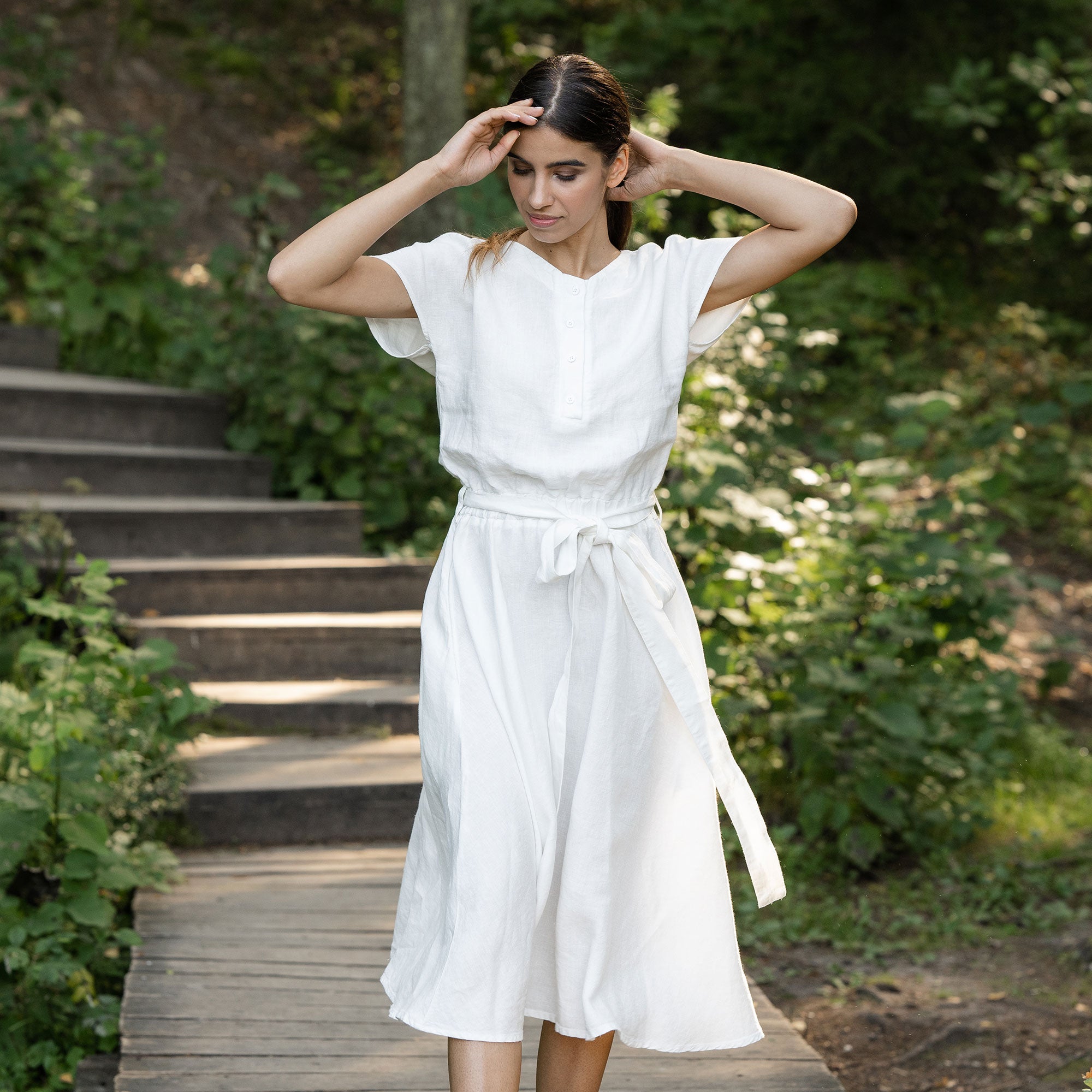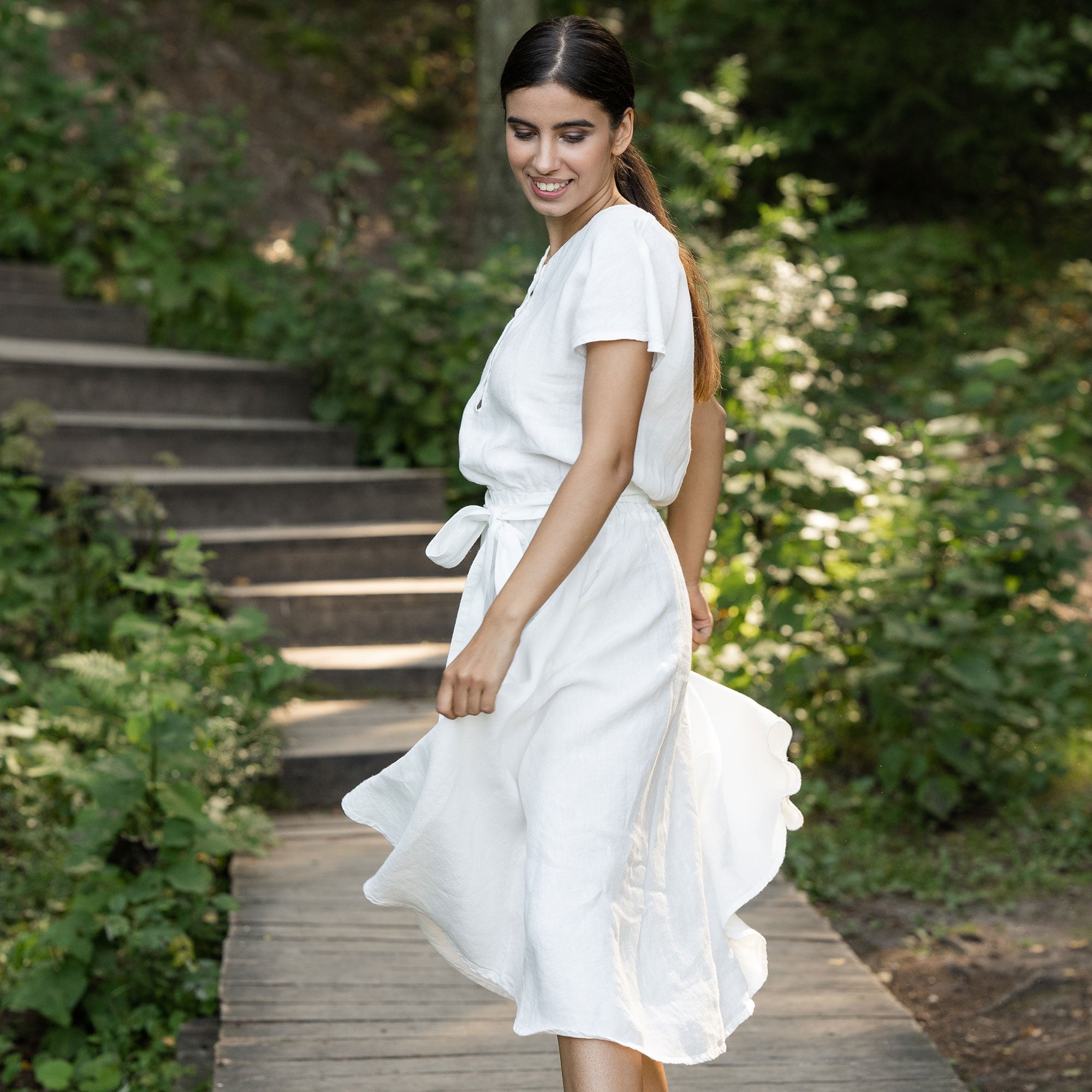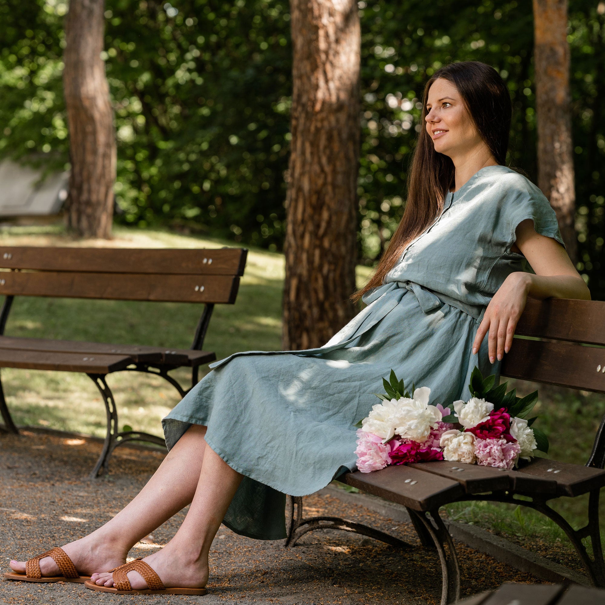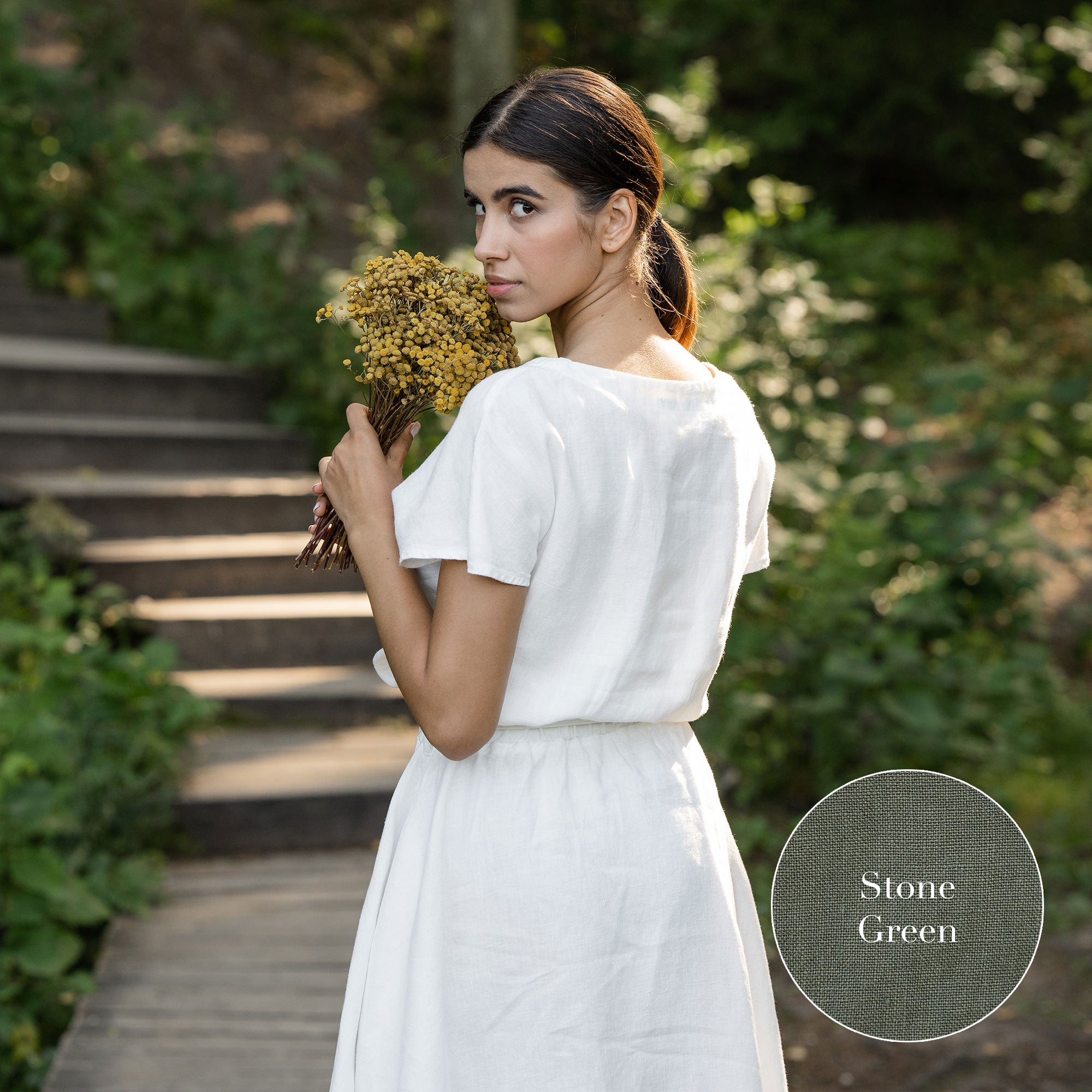 Featuring a flowy skirt, cap sleeves, and a gentle V-neckline, our women's dress is consciously made from organic 100% Linen fabric. You can dress this sun dress with heels or down with strappy sandals.