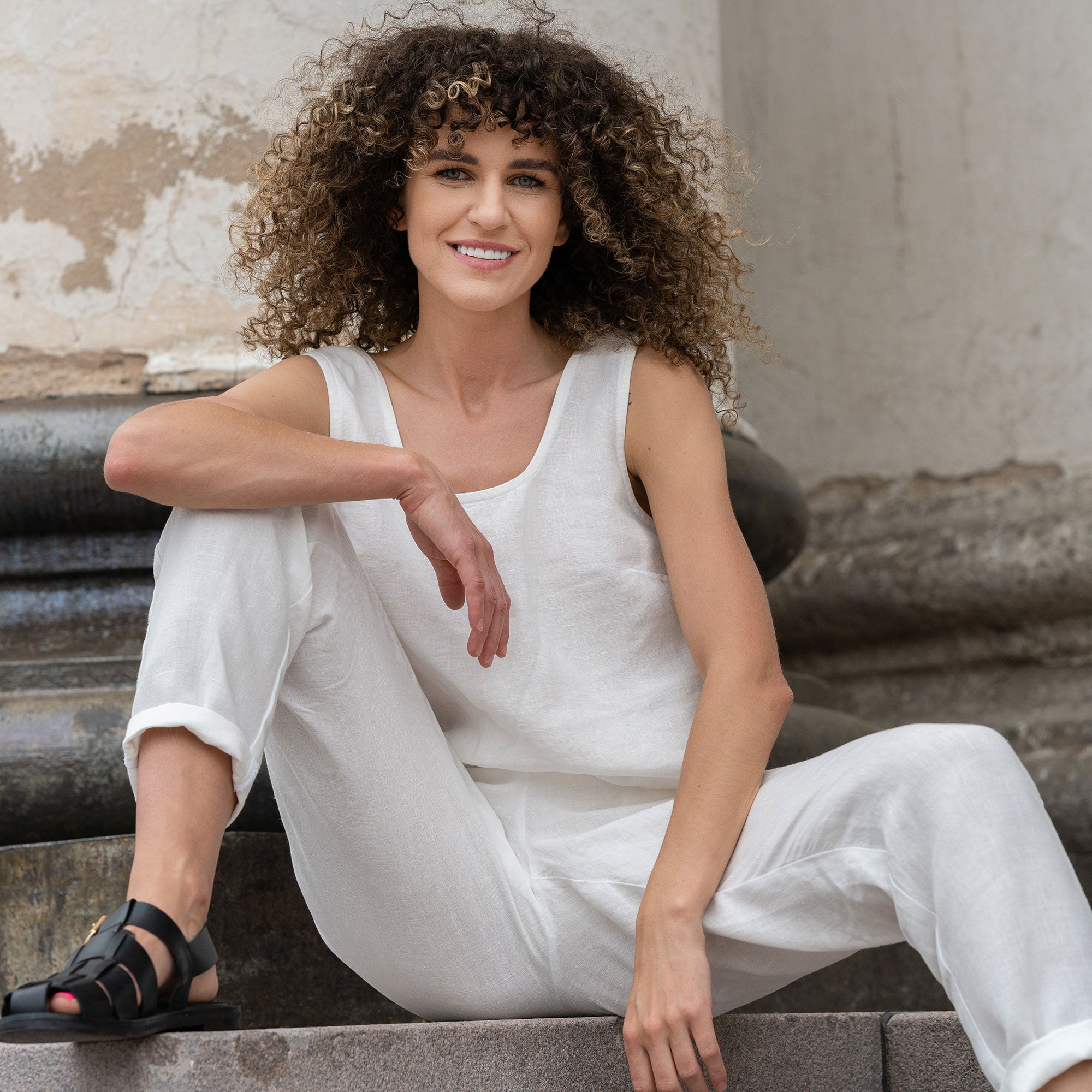 Two-piece set is made from 100% Linen, which is not only sustainable and organic but also incredibly soft and breathable. The Ana crop top blouse and Dakota trousers are designed to keep you comfortable all day long.