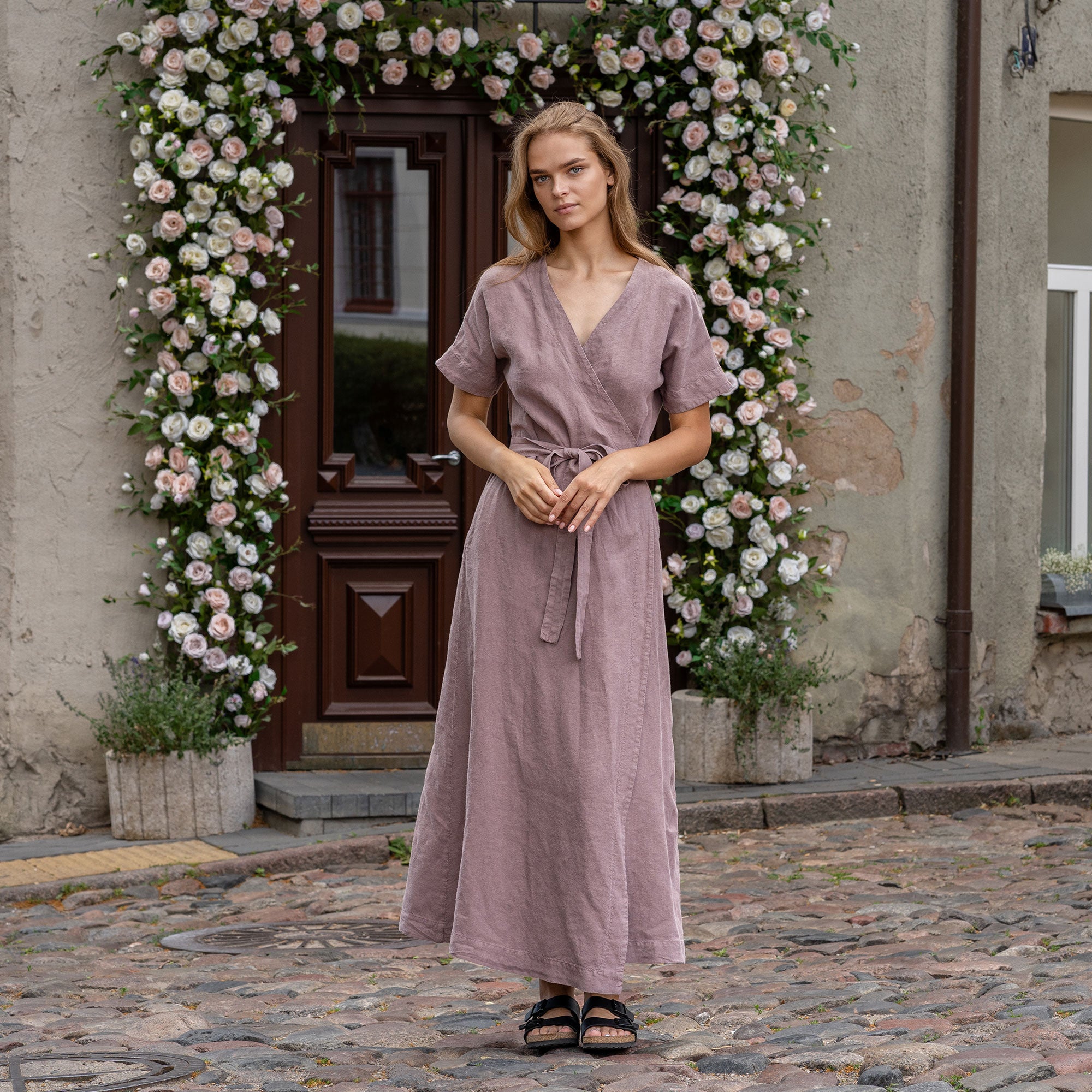Sustainable summer dress made of 100% organic Linen fabric with a unique wrap-around design. With an elegant V-neckline, kimono sleeves, and tie belt that defines your waist, your new maxi wrap dress will be perfect for many occasions. A linen maxi dress for women is perfect for a wedding guest look.