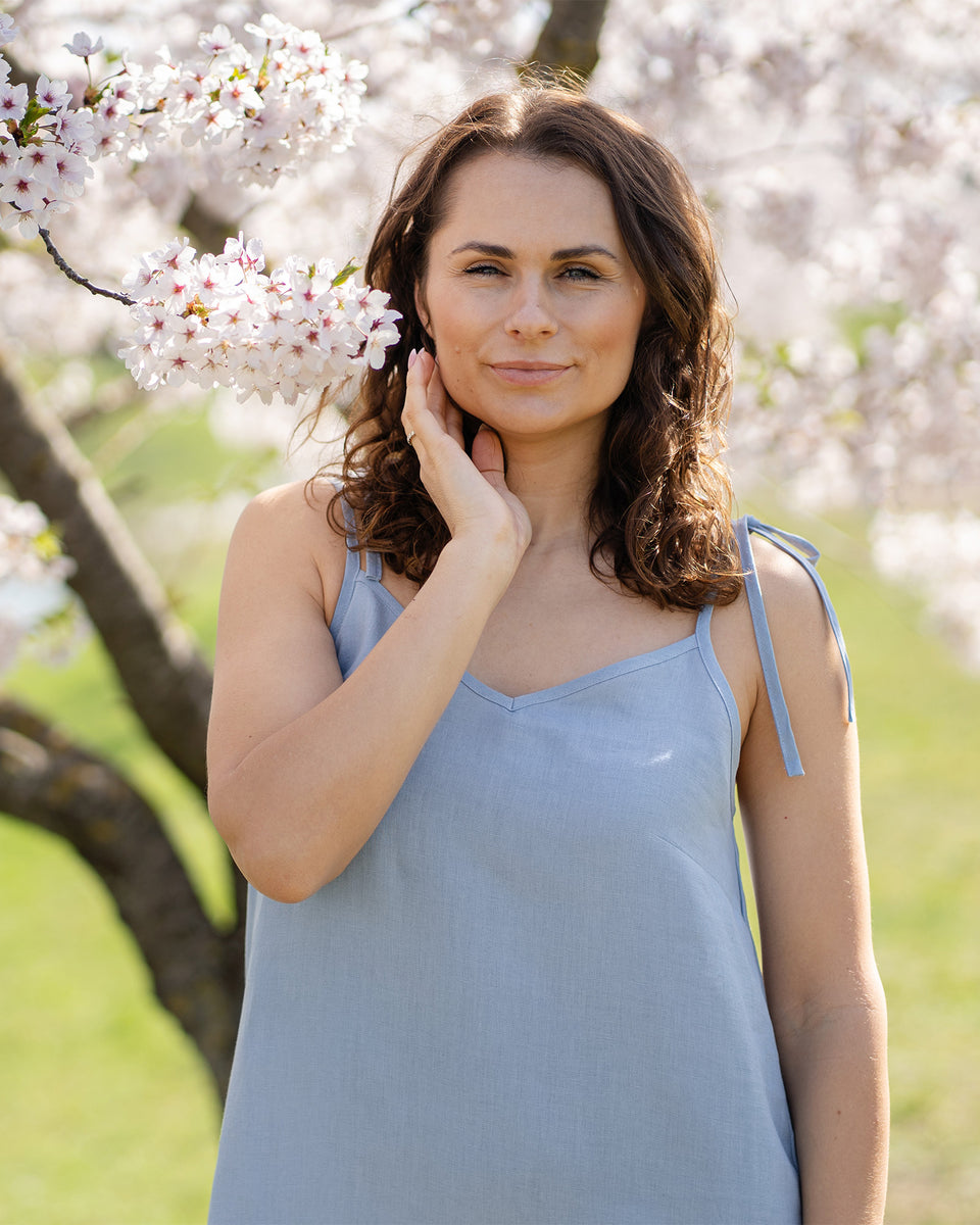 Our summer dress is made from 100% organic and sustainable Linen material. Linen dress features adjustable spaghetti straps, a midi length, and a subtle V-front neckline. The breathable fabric keeps you cool and fresh in warmer weather. Also, this stylish linen dress can be layered-up for day with tights and a sweater.
