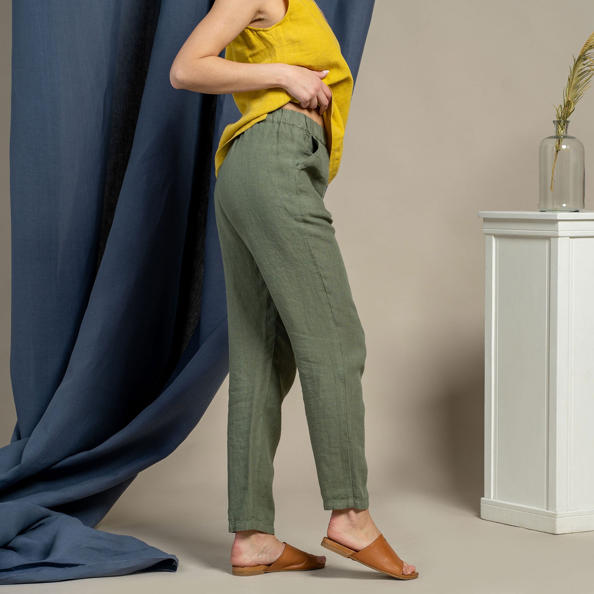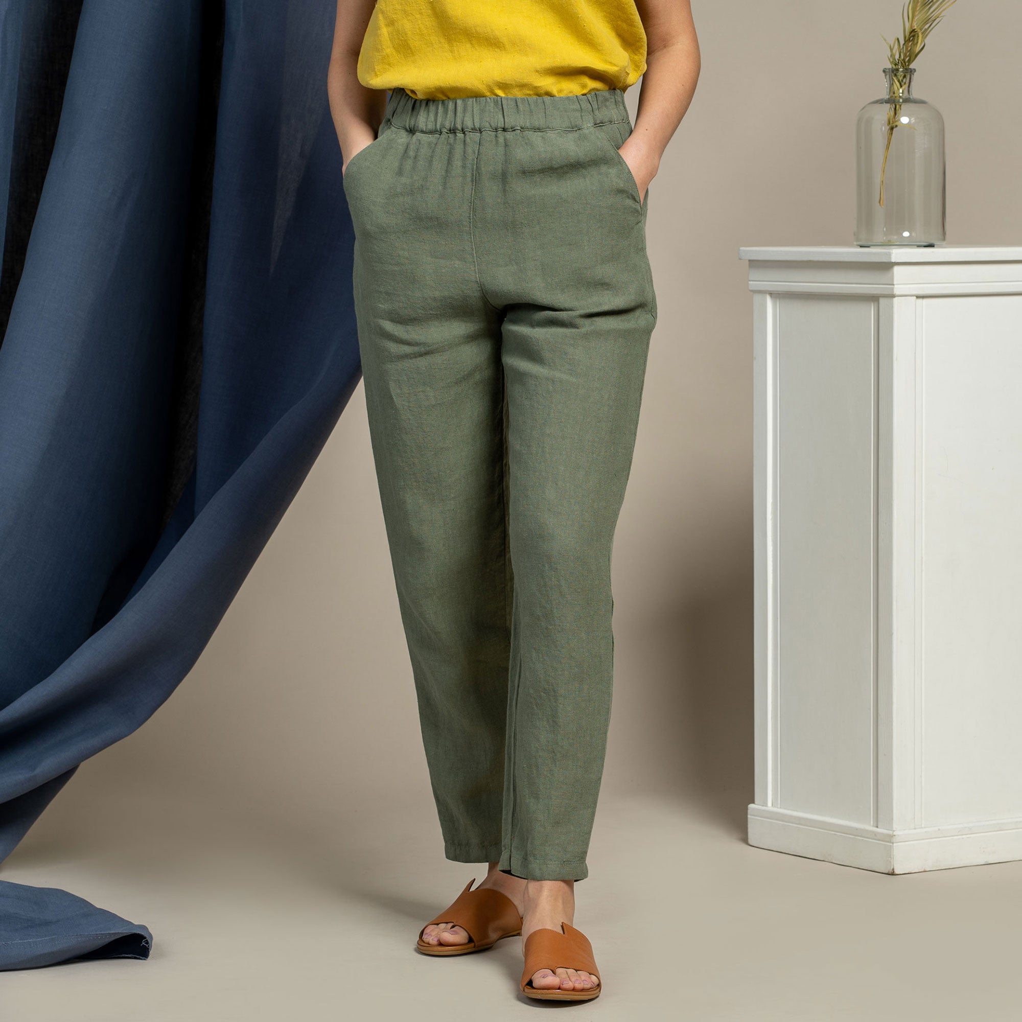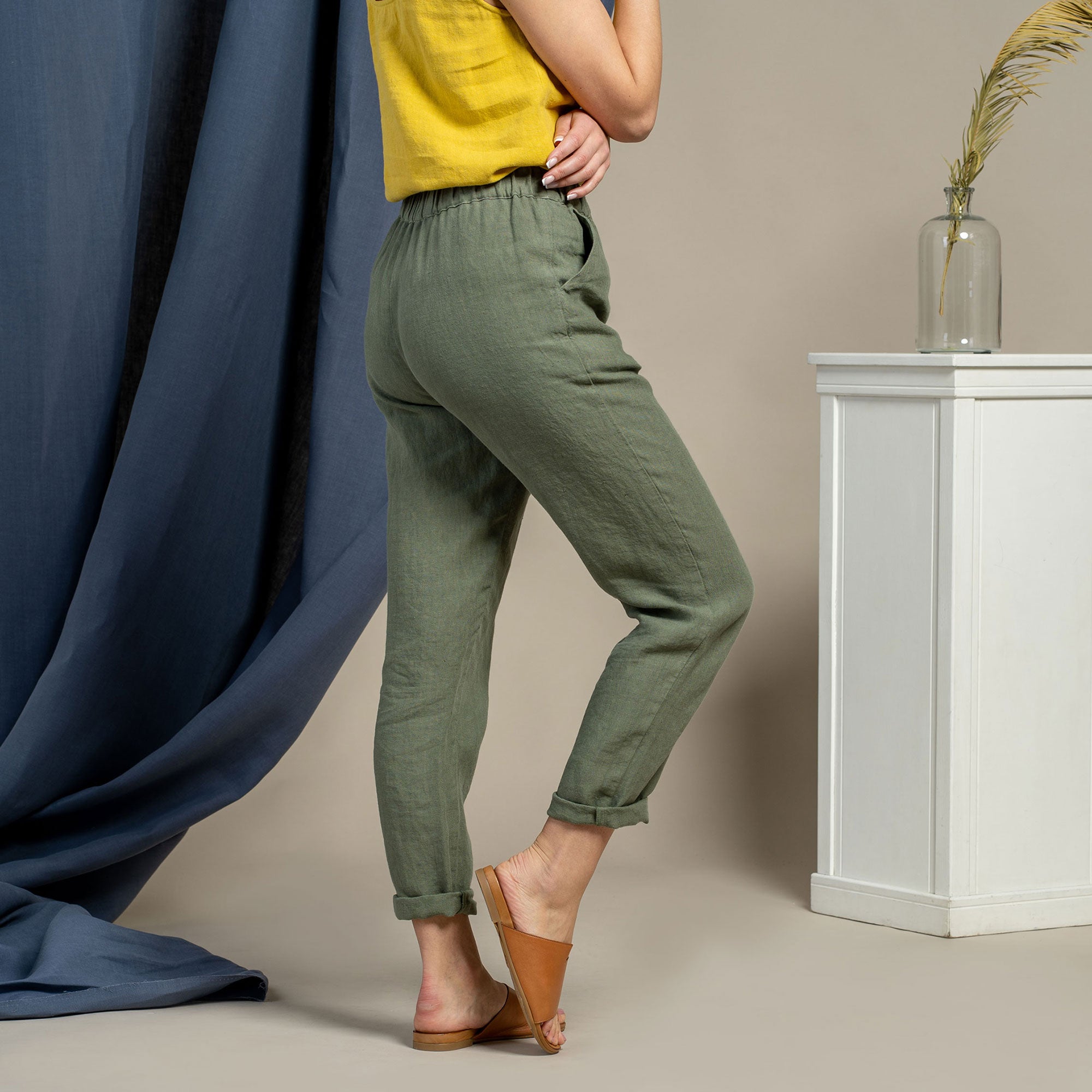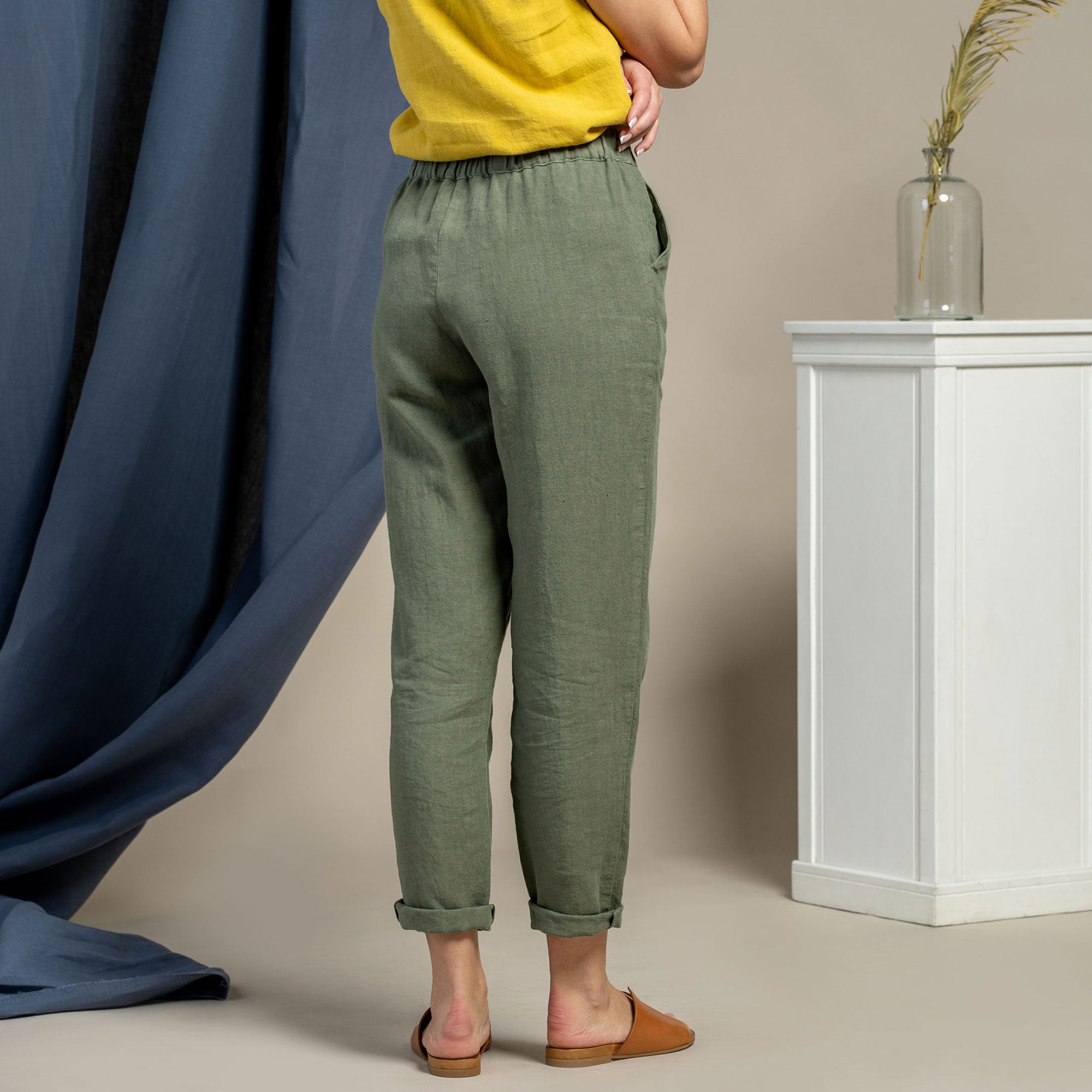 Dakota pants made from strong and natural 100% Linen, are cinched higher on the waist, featuring a classic design and an elastic waistband for comfortable wear across all body types. The tapered legs will look just as good with heels as they will with trainers, and you can just cuff them up to whatever length works for you and go.