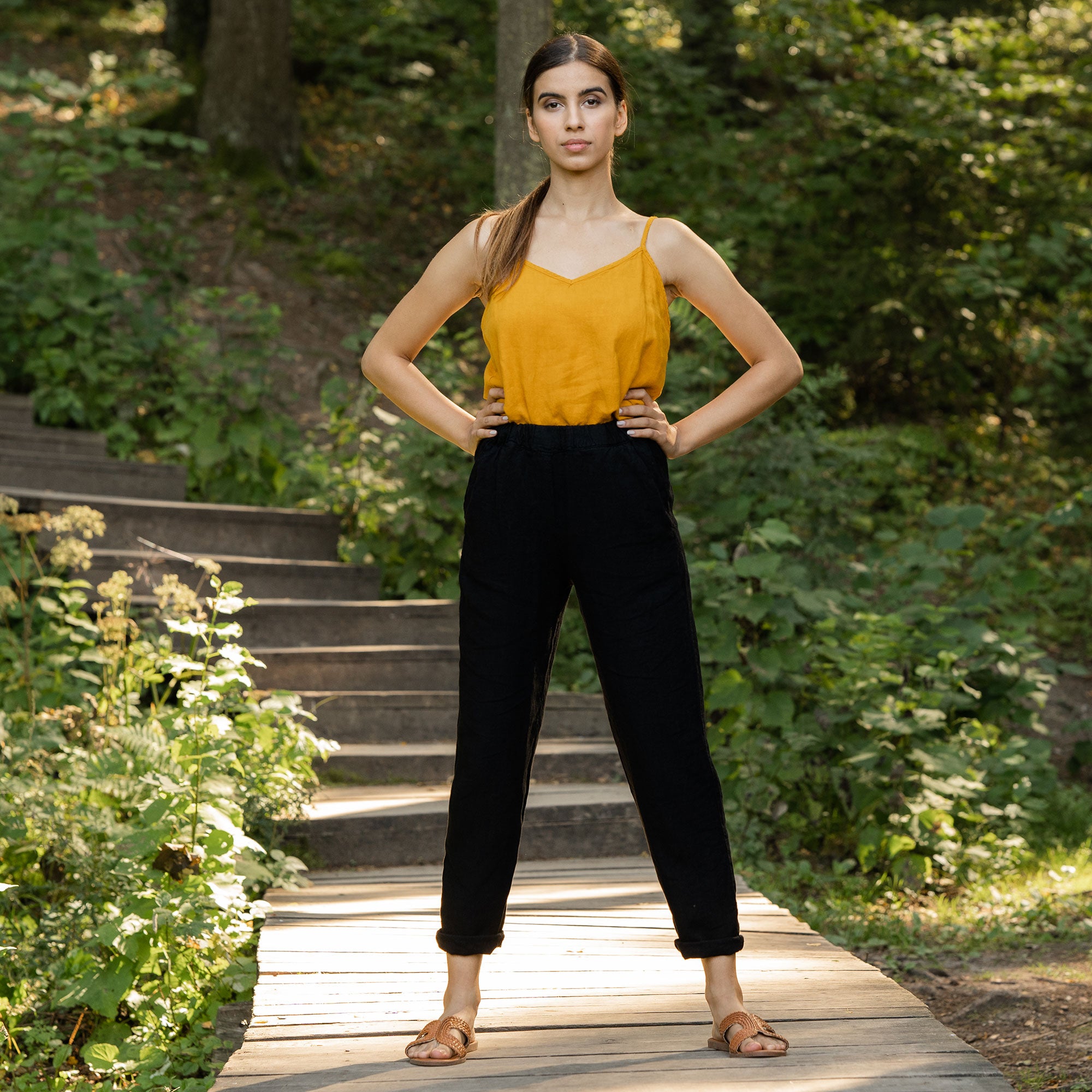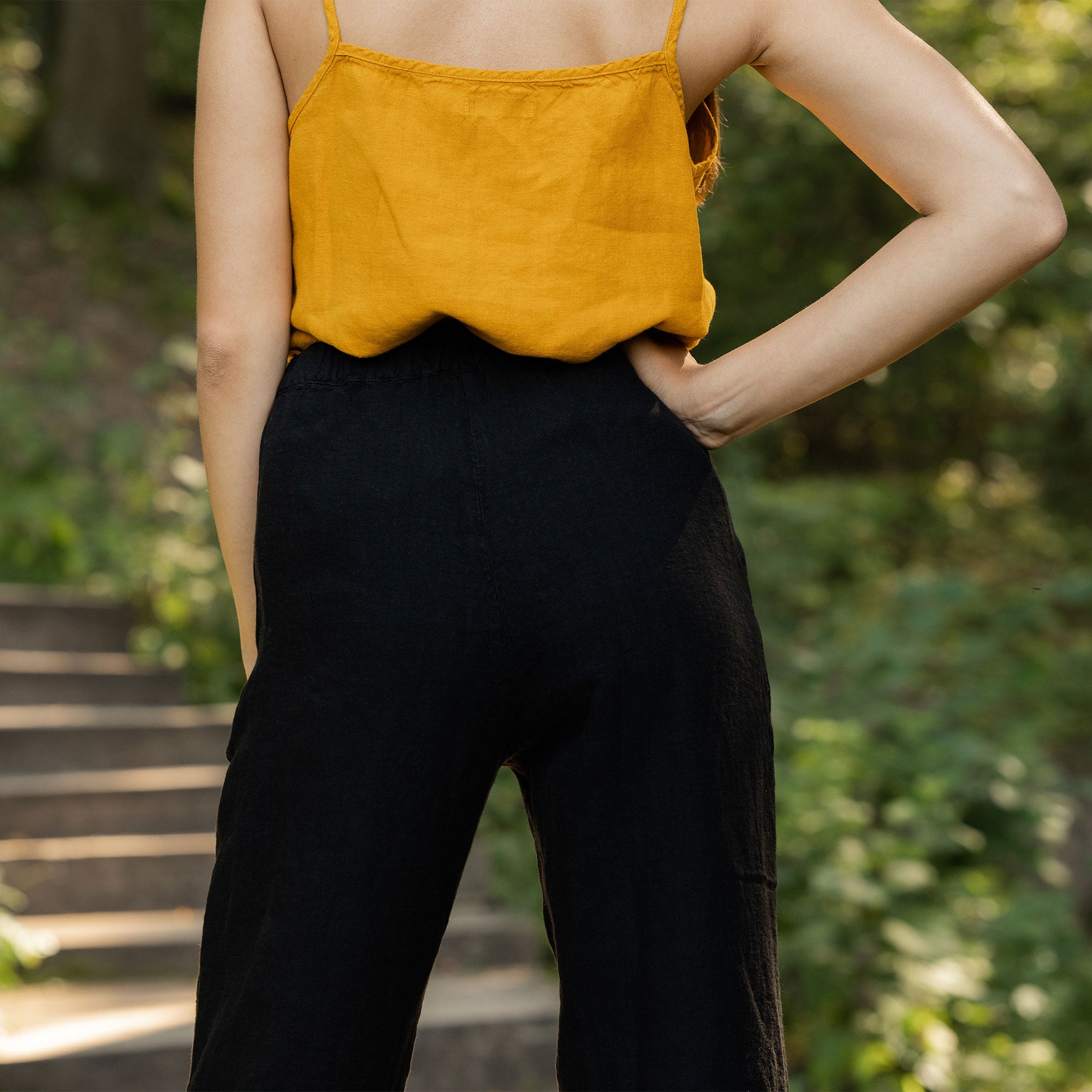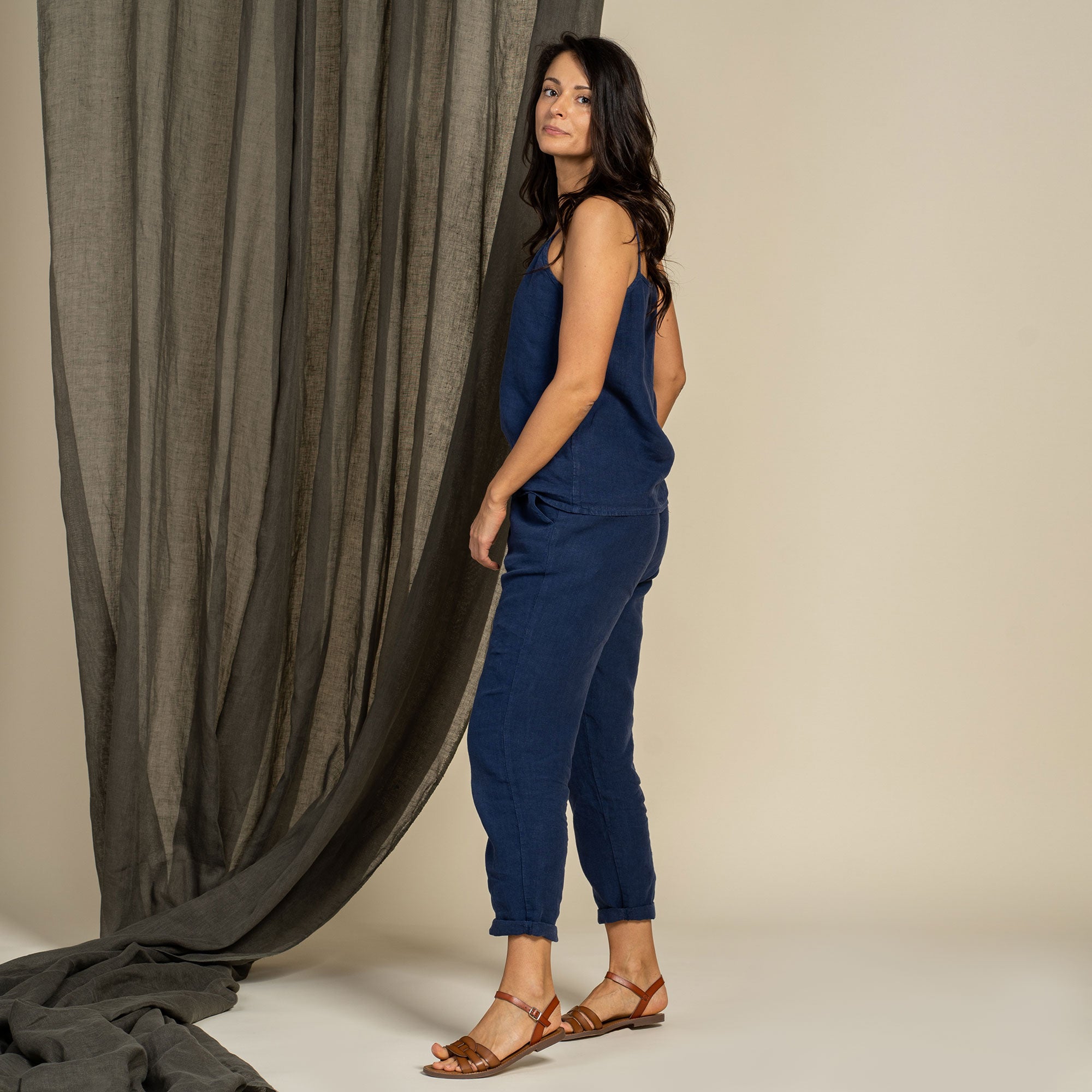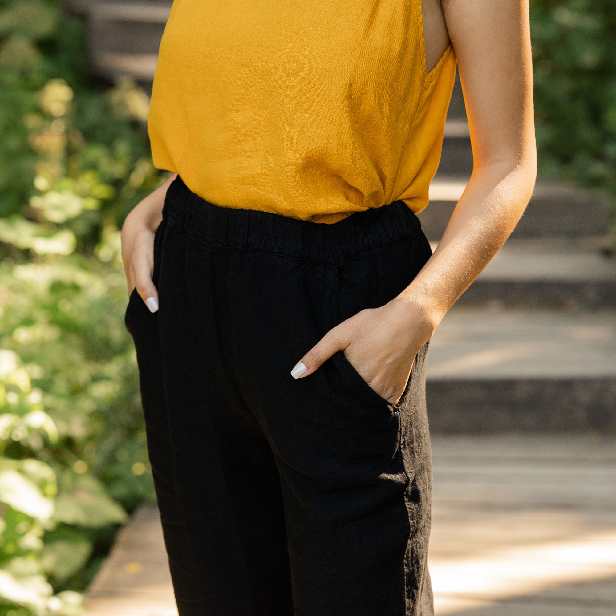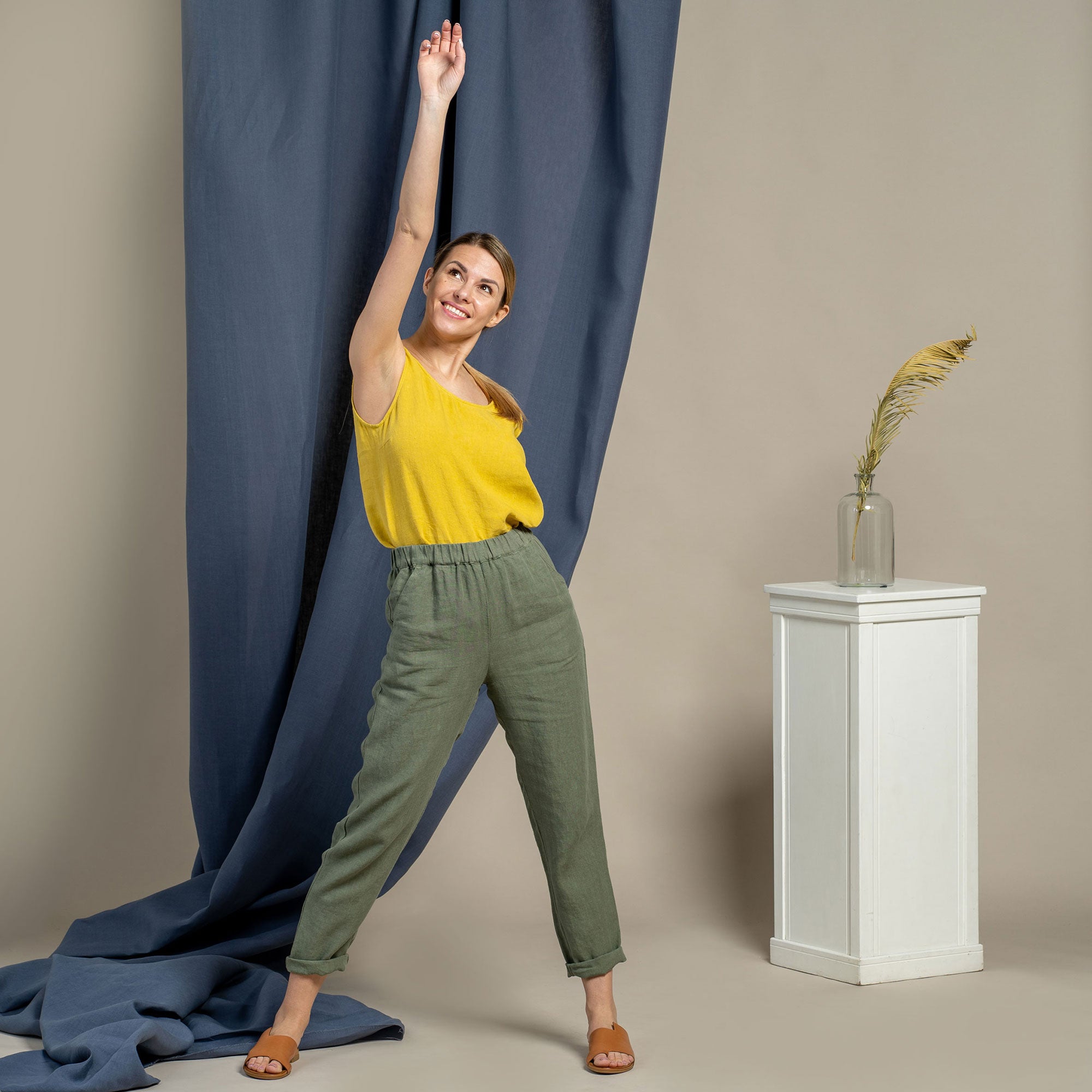 Dakota pants made from strong and natural 100% Linen, are cinched higher on the waist, featuring a classic design and an elastic waistband for comfortable wear across all body types. The tapered legs will look just as good with heels as they will with trainers, and you can just cuff them up to whatever length works for you and go.