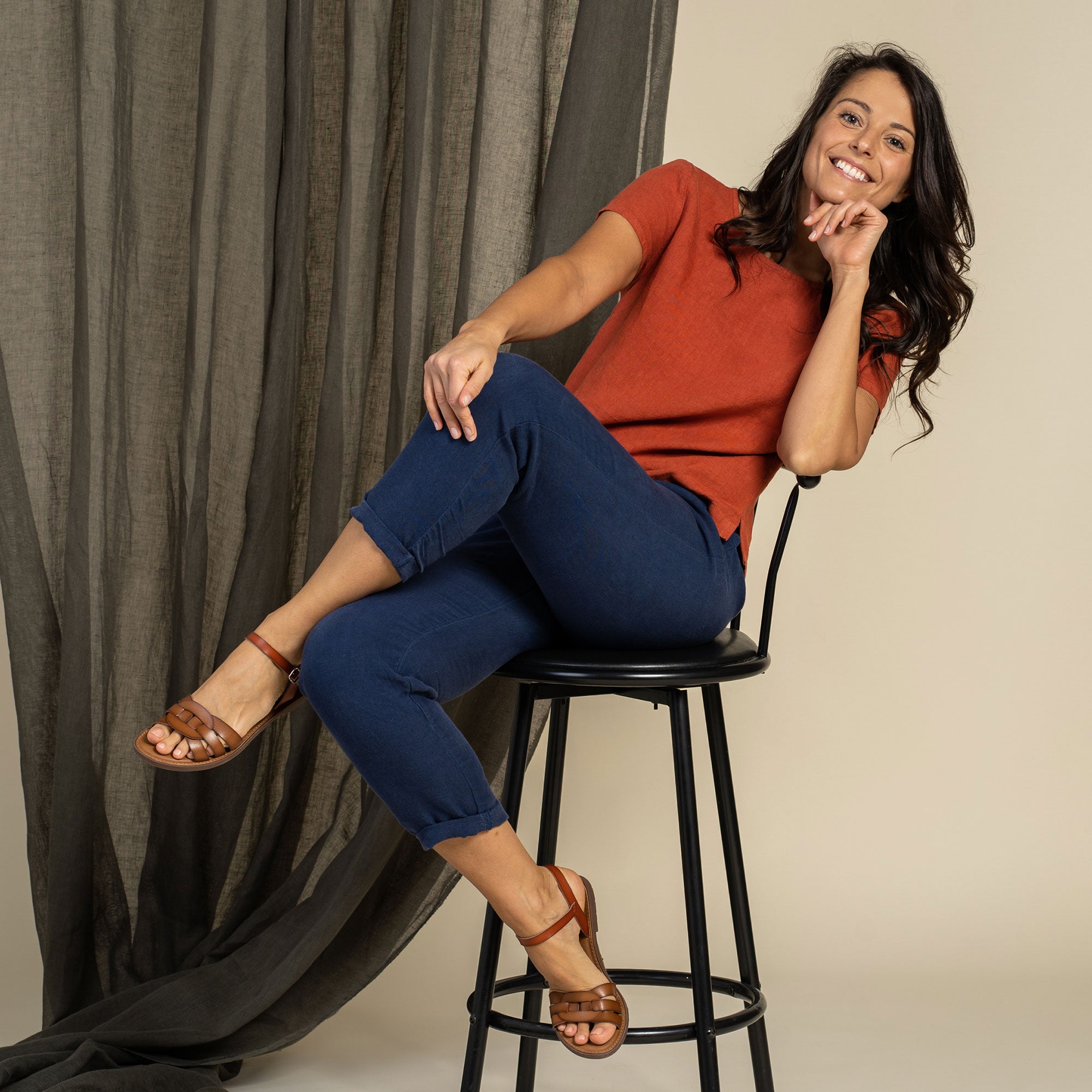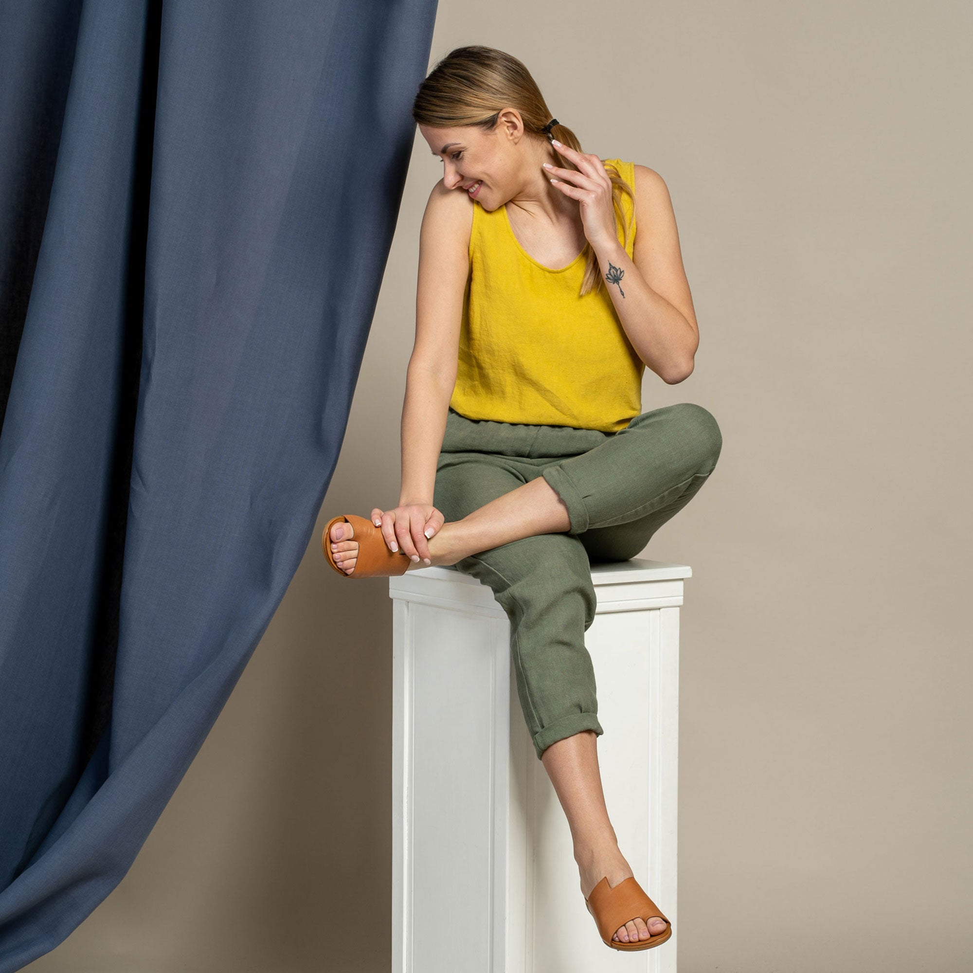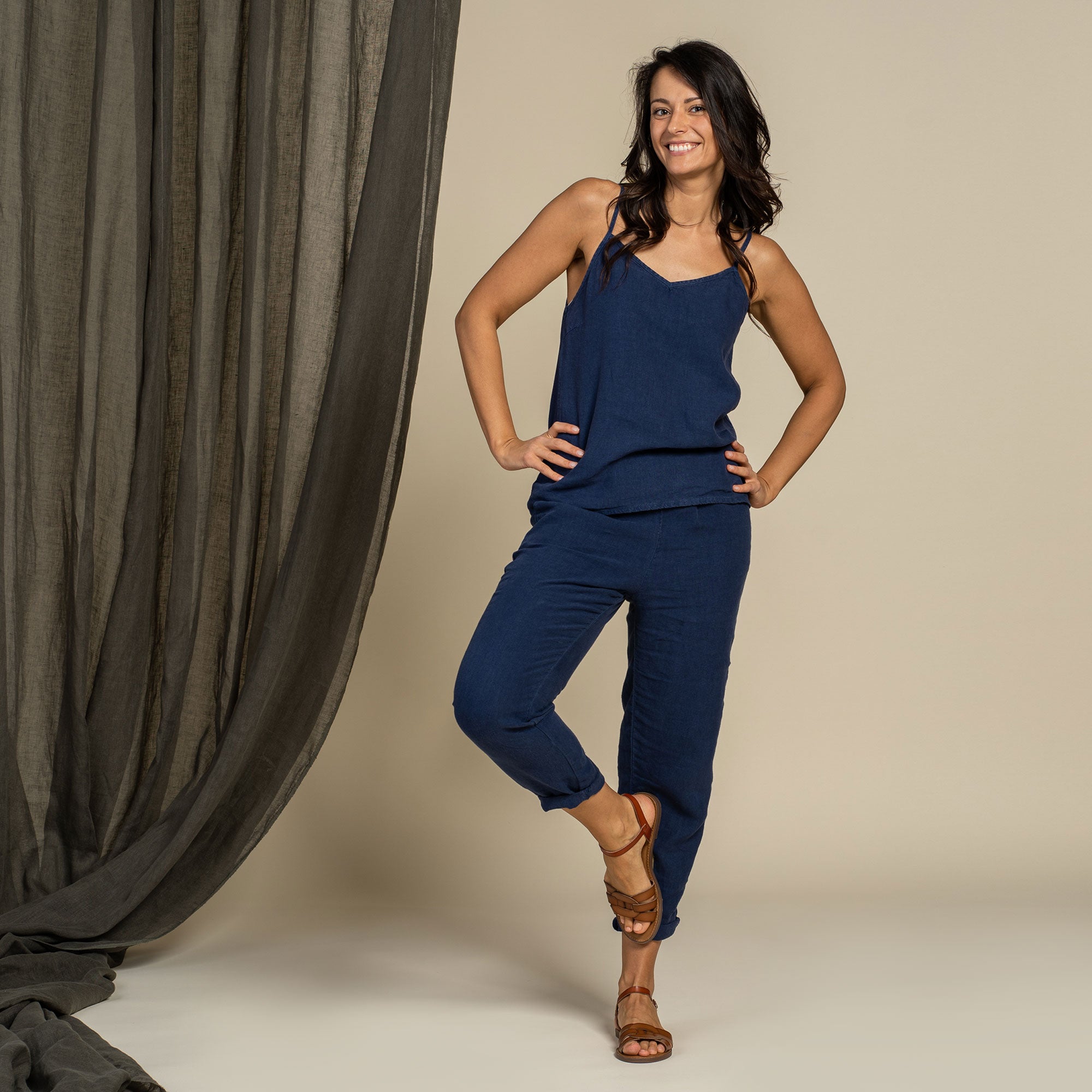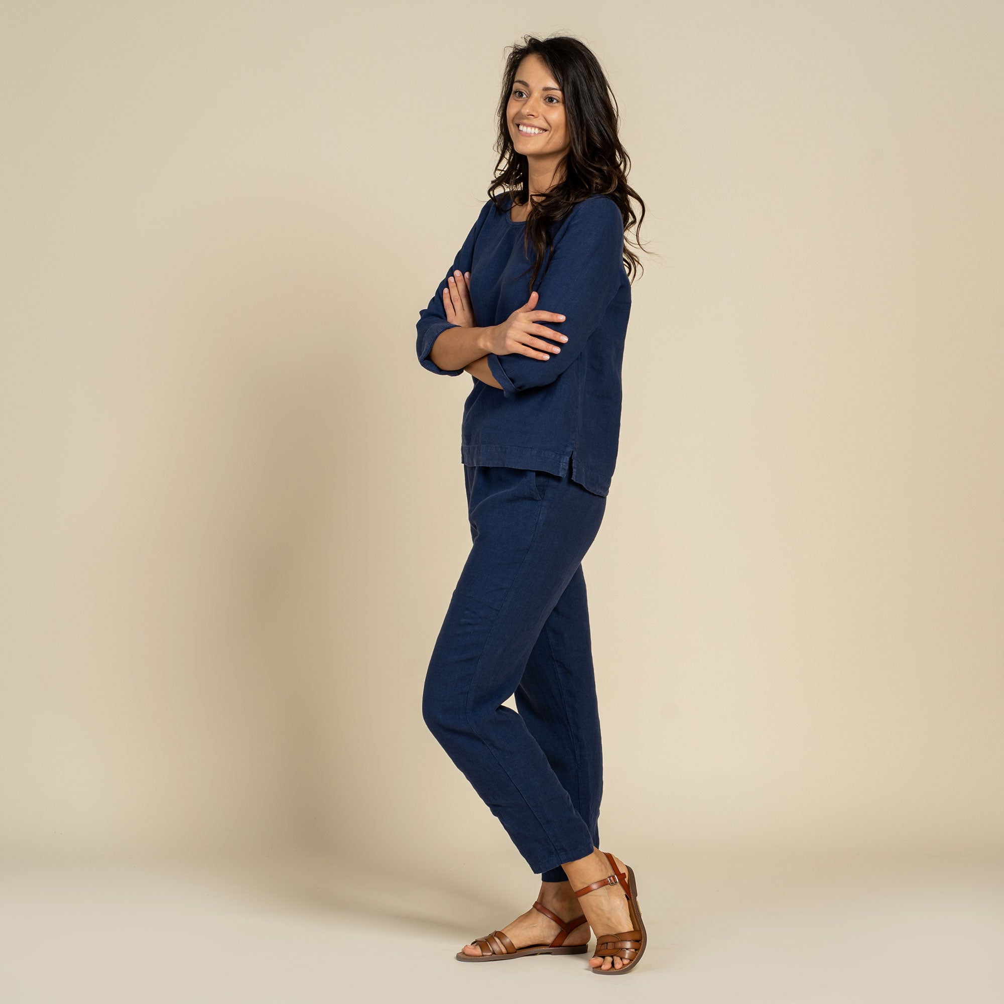 Dakota pants made from strong and natural 100% Linen, are cinched higher on the waist, featuring a classic design and an elastic waistband for comfortable wear across all body types. The tapered legs will look just as good with heels as they will with trainers, and you can just cuff them up to whatever length works for you and go.