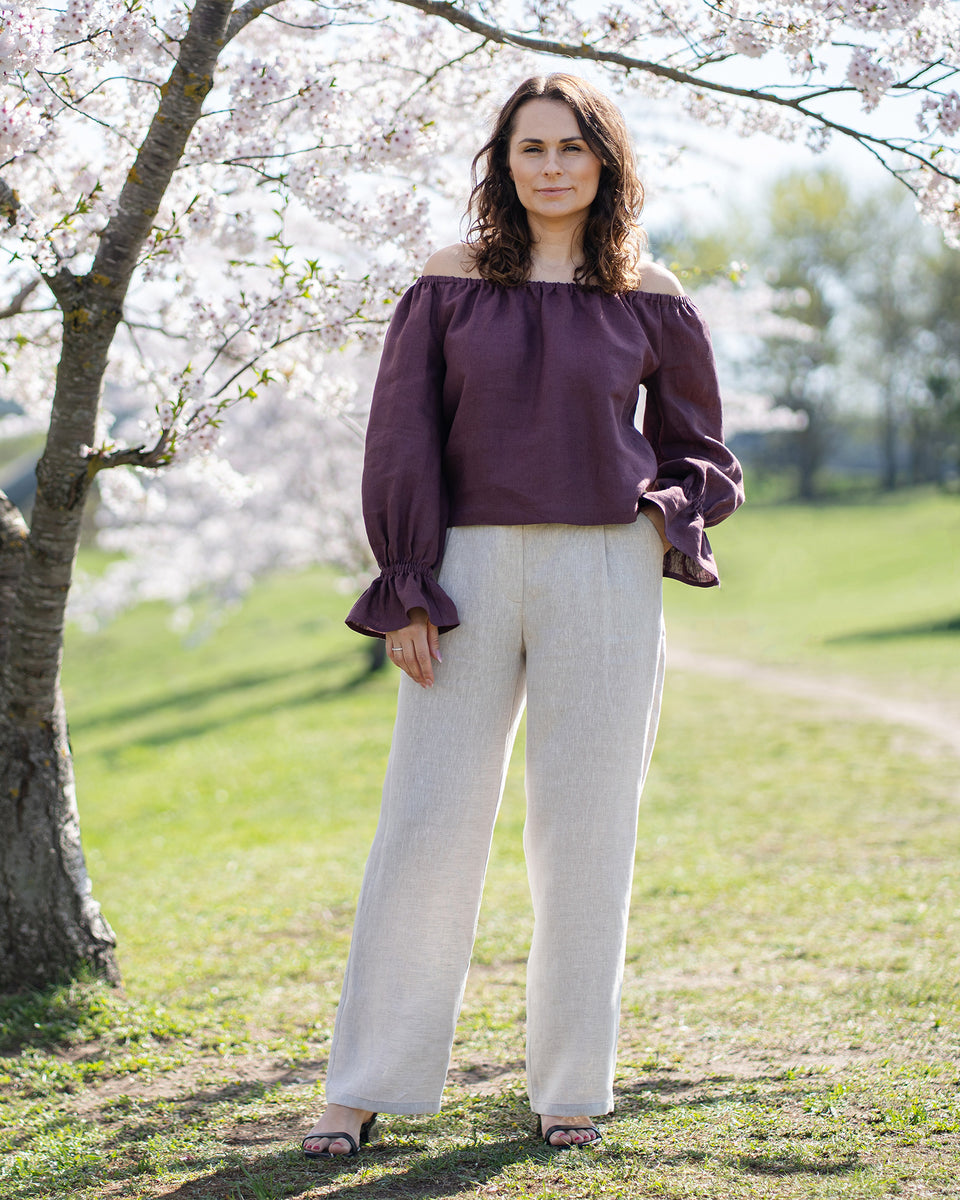 Showcase your shoulders with our off the shoulder Linen top Jessica. Made from lightweight premium Linen, this long sleeve top offers a soft, caressing feel, while the elastic neckline and wrists ensure a comfortable fit. Whether it's a candlelit dinner or a romantic rendezvous, this puff sleeve blouse is perfect for special events. Embrace the magic of love and captivate hearts with this enchanting garment!