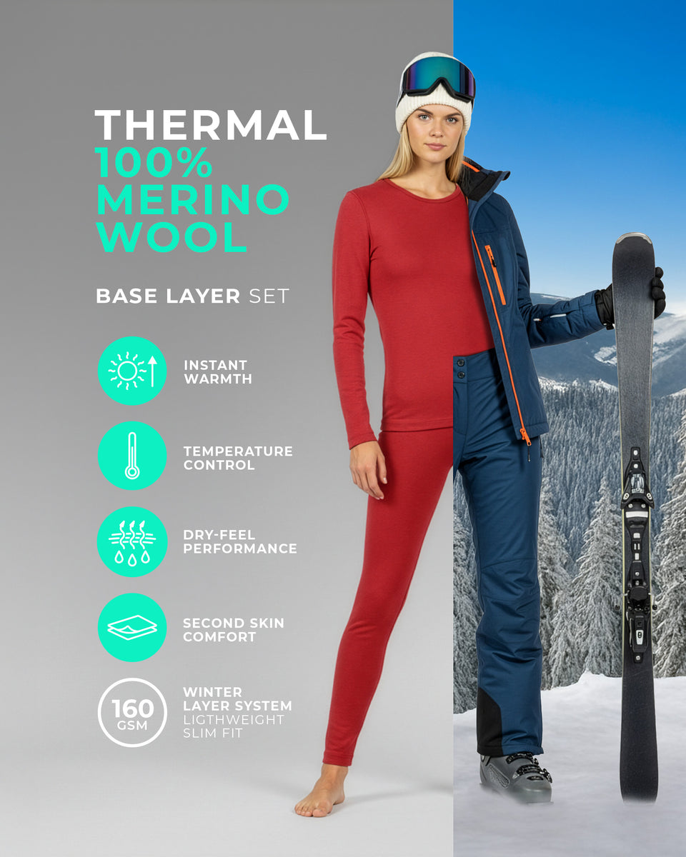 Light as a feather and comfortable at the same time – women’s long-sleeve top and leggings set is built for smart layering. Made from soft, breathable 160gsm 100% Merino wool, thermal set works as a next-to-skin layer that helps regulate temperature: warming you up in the cold and staying fresh when conditions shift. Designed to sit smoothly under mid and outer layers, the long-sleeve top features flatlock seams to reduce bulk and friction, while the elastic leggings move easily and stay in place for all-day wear. Both pieces are non-itchy and naturally odor-resistant, making the base layer set ideal for active outdoor use, travel, and everyday comfort at home. From winter layering to cool summer evenings, this versatile Merino wool set fits seamlessly into any wardrobe, any season.